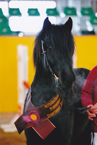 Unser „Nabucco“ war der Letzte und daher stieg unsere Nervosität in’s Unermessliche. Plötzlich hieß es :“Nun der letzte Hengst , der Fellponyhengst Nabucco vom Schieferberg und hier bitte ich um die Siegerfanfare !“ An mehr kann ich mich nicht erinnern, bei mir und Stef kullerten die Freudentränen synchron übers Gesicht .Vorführer Schmidti war so konzentriert auf `s vorführen, das er erst gar nicht mit bekam, was los war. Erst als er sah, wie uns die Tränen liefen, hat er es realisiert. Man kann gar nicht beschreiben, was da in einem vorgeht, das muss man erleben! Ich hatte abends noch Gänsehaut, wenn ich daran gedacht habe und so richtig realisiert habe ich es erst am nächsten Tag .